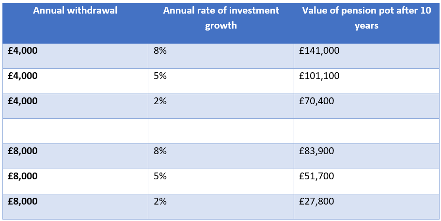 The following table compares the effects of various withdrawal rates and investment growth levels on a £100,000 pension pot after 10 years.
